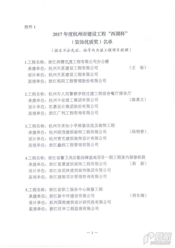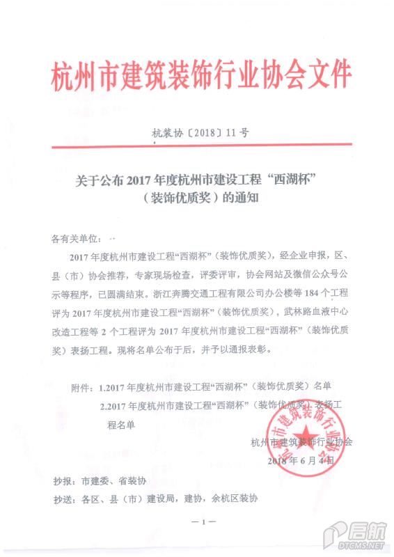 2017年度杭州市建設工程“西湖杯”(裝飾優質獎)
